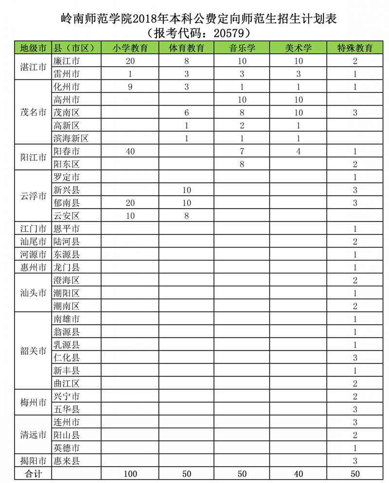 答:我校2018年招收本科层次公费师范生290名,包括学前教育、特殊教育、小学教育、体育教育、美术学和音乐学等师范专业,面向广东全省范围招生。被录取后签订三方公费定向培养协议书,免交学费和住宿费,每生每年享受生活补助费8000元。具体报考及录取办法按照广东省招生委员会规定执行。