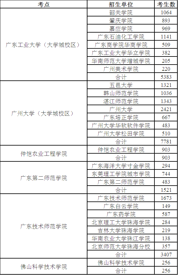 1.广东工业大学(大学城校区,地址:广州市番禺区广州大学城外环西路100号)考点:报考韶关学院、肇庆学院、嘉应学院、广东石油化工学院、广东商学院华商学院、广东工业大学华立学院、华南师范大学增城学院、广州美术学院的考生;