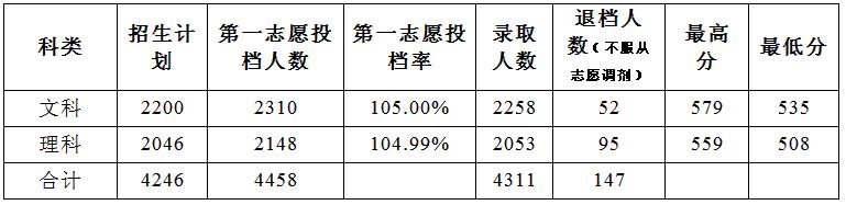 7月22日,我校在广东省普通高考2A录取工作已圆满结束,所有科类均在第一志愿完成录取任务。从我校第一志愿投档情况看,文科投档最低分为535分,比省控线高1分,原计划2200人,投档2310人,录取2258人;理科投档最低分为508分,比省控线高4分,原计划2046人,投档2148人,录取2053人。文理科录取最高分分别为579和559,达到或接近广东省第一批次分数线。文理科考生共有147人因不服从专业调剂均退档。