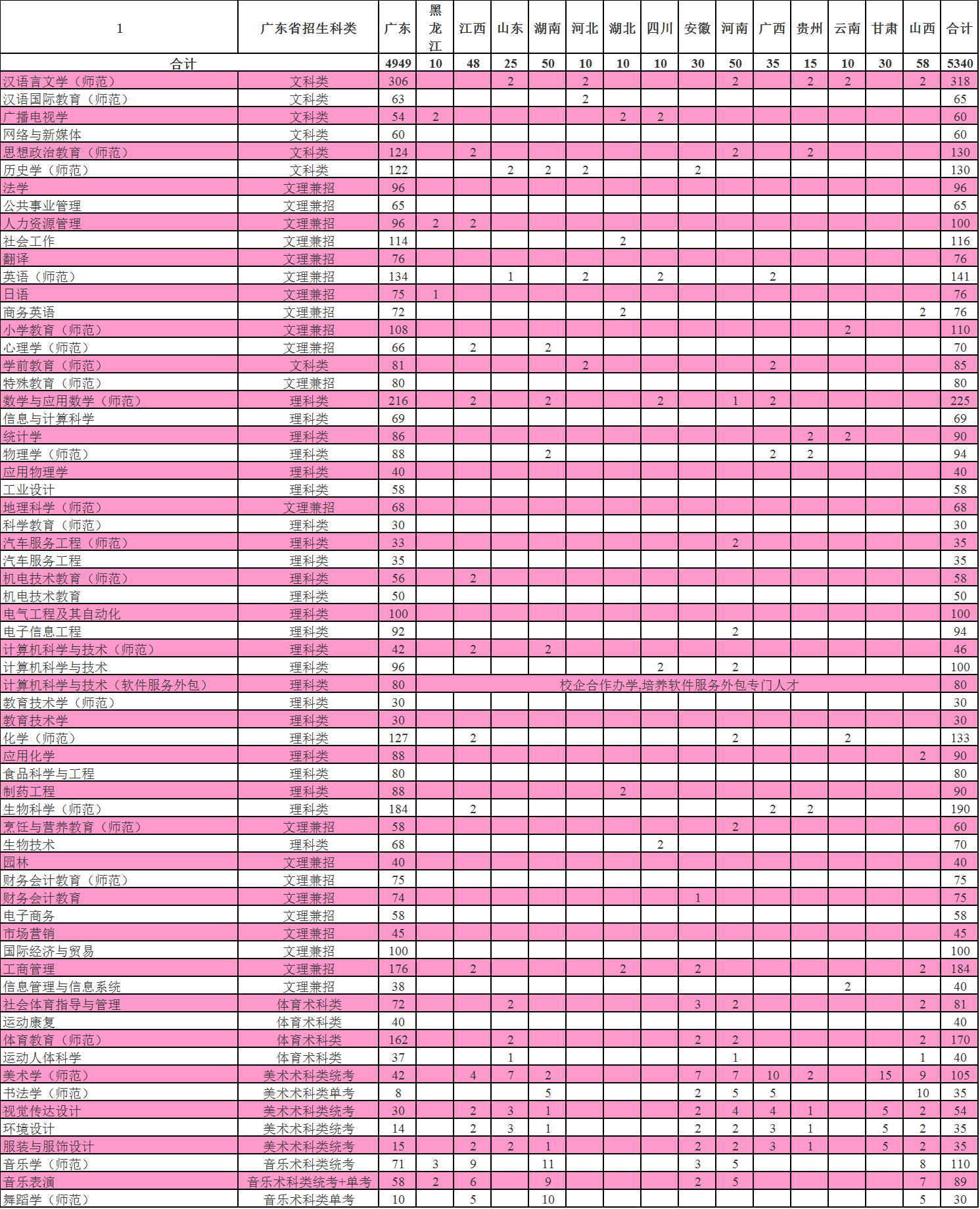 答:我校本科普通类专业一般安排在第二批录取,艺术类专业一般安排在提前批次录取;专科安排在第三批A类录取,具体以各生源省份招办公布的招生专业目录为准。我校今年普通本科招生计划5340名,面向广东、山西、安徽、河南、广西、贵州、云南、甘肃、江西、山东、湖北、湖南、四川、河北、黑龙江等省份(自治区)招生;专科招生计划1308名,只招广东考生。
