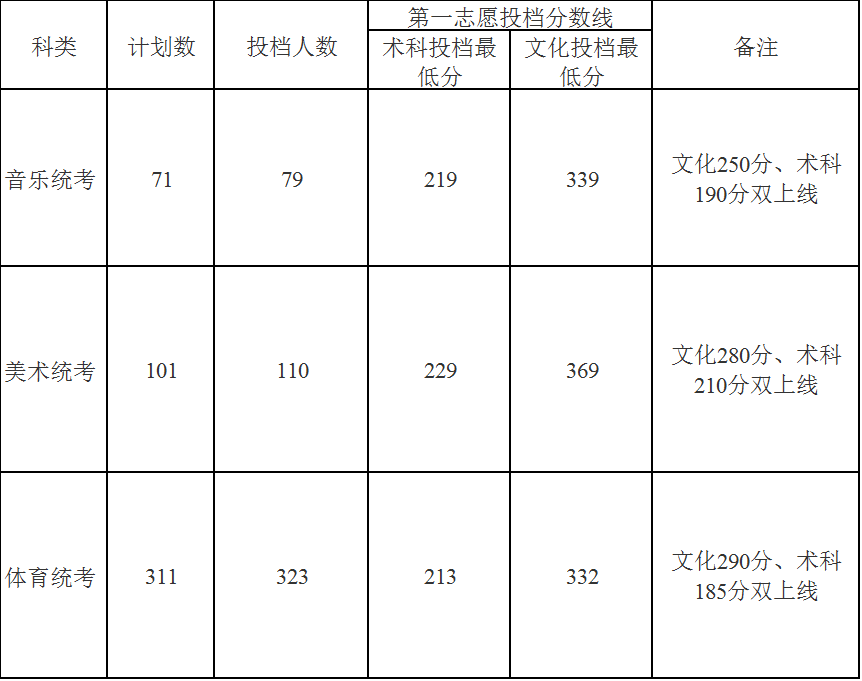 我校2016年广东省第二批本科音乐、美术和体育统考类第一志愿投档情况公告 录入:zsbxs01 负责编辑:zsbxs01 浏览量: 发布时间:2016-07-18 广东省艺术类及体育统考类本科于7月18日下午投档,我校各科类投档情况如下(按术科投档最低分/按文化投档最低分): 说明:凡考生分数符合“备注”列条件,并且其中任一项分数达到我校相应投档线,即表示已投档我校(压线者除外)。 19 更多 上一条:我校2016年广东省第二批本科音乐、美术和体育类统考专业第一志愿录取公告 下一条:岭南师范学院2016年普通本科招生录取情况公告(不断更新)