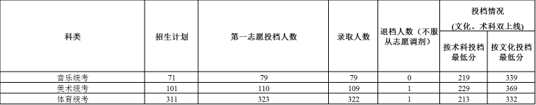 我校2016年广东省第二批本科音乐、美术和体育类统考专业第一志愿录取公告 录入:zsbxs01 负责编辑:zsbxs01 浏览量: 发布时间:2016-07-20 我校2016年广东省第二批本科音乐、美术和体育类统考专业第一志愿于2016年7月18日开始录取,所有专业均在第一志愿完成录取任务。我校音乐、美术和体育类统考专业增加了27个计划,所有投档并服从调剂的考生全部录取,共有2人因所报专业无法录取并且不服从调剂的考生均退档。现将第一志愿投档录取情况公布如下: 至此,我校2016年广东省第二批本科音乐、美术和体育类统考专业招生录取已结束。录取结果已上网,查询网址:点击进入 29 更多 上一条:我校2016年广东本科第二批文理科第一志愿投档情况公告 下一条:我校2016年广东省第二批本科音乐、美术和体育统考类第一志愿投档情况公告