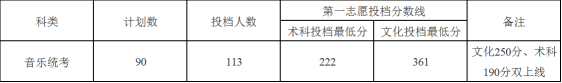 我校2017年广东省第二批本科音乐统考类第一志愿投档情况公告 录入:zsbxs01 负责编辑:zsbxs01 浏览量: 发布时间:2017-07-20 广东省音乐统考于7月19日下午投档,我校投档情况如下(按术科投档最低分/按文化投档最低分): 说明:凡考生分数符合“备注”列条件,并且其中任一项分数达到我校相应投档线,即表示已投档我校(压线者除外)。 693 更多 上一条:我校2017年广东省第二批本科音乐、美术和体育统考类第一志愿投档公告 下一条:我校2017年广东省第二批本科音乐、美术和体育统考类第一志愿投档公告