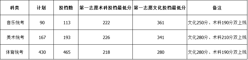 我校2017年广东省第二批本科音乐、美术和体育统考类第一志愿投档公告 录入:admin 负责编辑:admin 浏览量: 发布时间:2017-07-20 广东省艺术类及体育统考类本科于7月20日下午投档,我校各科类投档情况如下(按术科投档最低分/按文化投档最低分): 说明:凡考生分数符合“备注”列条件,并且其中任一项分数达到我校相应投档线,即表示已投档我校(压线者除外)。 636 更多 上一条:我校2017年广东省第二批本科音乐统考类第一志愿投档情况公告 下一条:我校2017年广东省第二批本科音乐统考类第一志愿投档情况公告