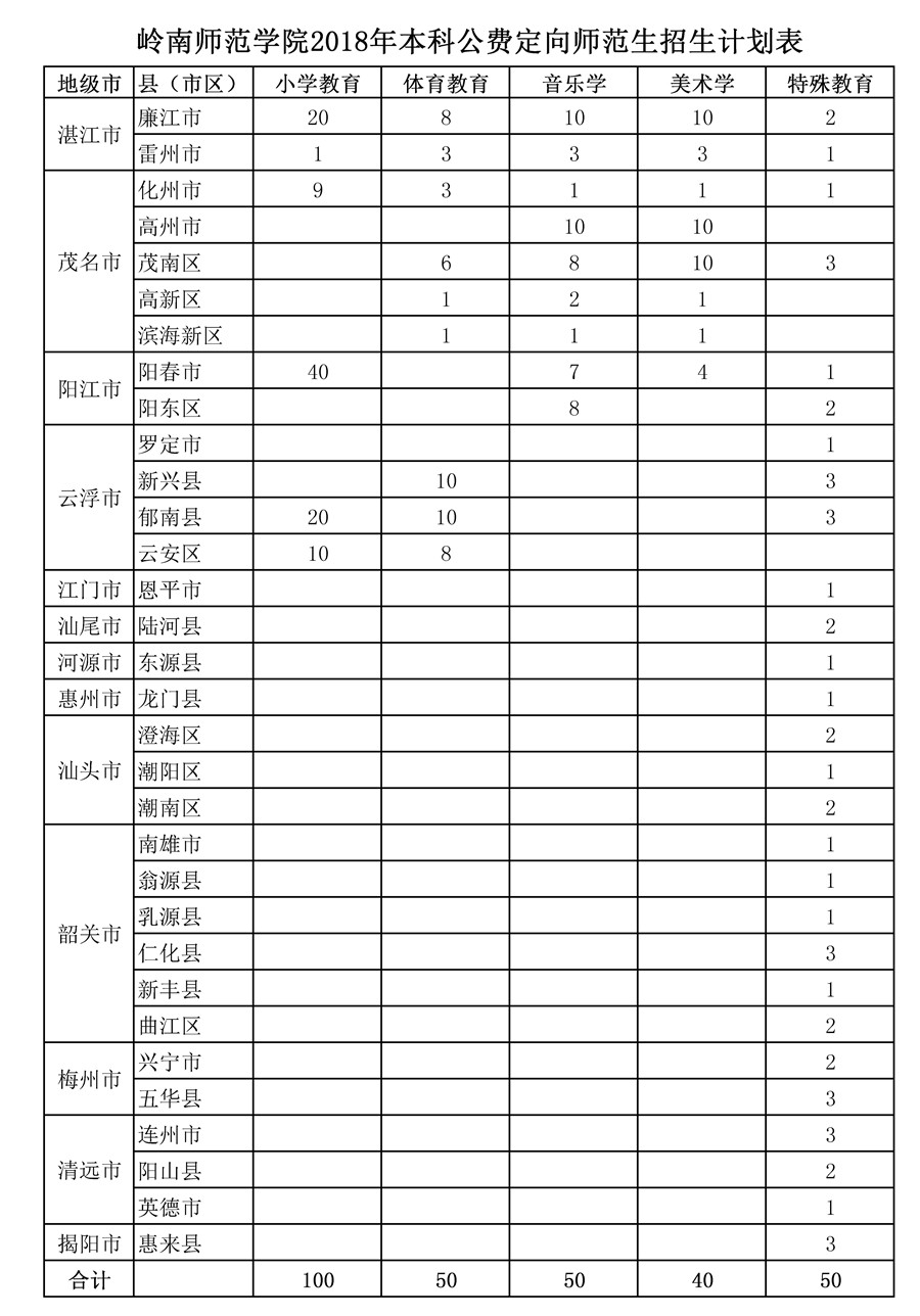 岭南师范学院2018年本科公费定向师范生招生计划表 录入: 负责编辑:招生办 浏览量: 发布时间:2018-06-01 上一条:岭南师范学院2018年本科招生计划(报考代码:10579) 下一条:岭南师范学院2018年专科招生计划(报考代码:10579)更新