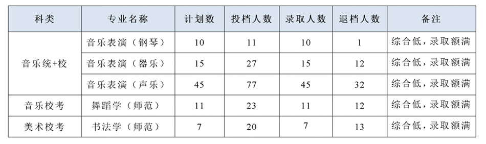 我校2018年广东省的本科批艺术校考专业于2018年7月17日投档录取,广东省招生办公室把第一志愿文化上线并且获得我校合格证的在库考生全投,各专业投档情况如下:音乐表演专业招生计划70人,投档115人;舞蹈学(师范)专业招生计划11人,投档23人;书法学(师范)专业招生计划7人,投档20人。根据学校招生章程的录取原则,对投出档案考生的文化课成绩和术科成绩按一定比例计算后得出综合分,按照综合分由高到低的顺序,优先安排高分考生的第一专业志愿,共有70名考生因综合分低录取额满而退档。现将我校艺术校考专业投档录取情况公布如下: