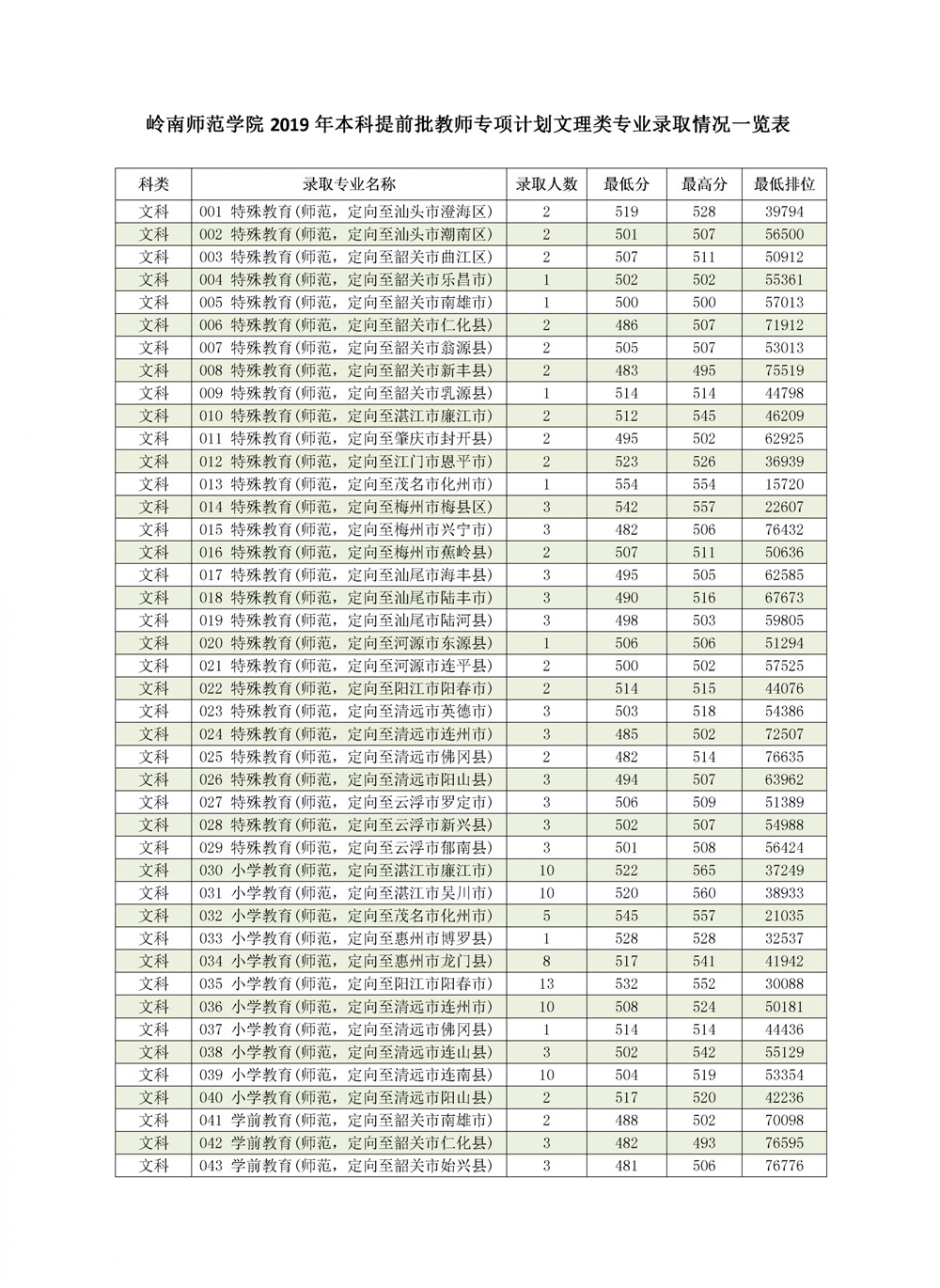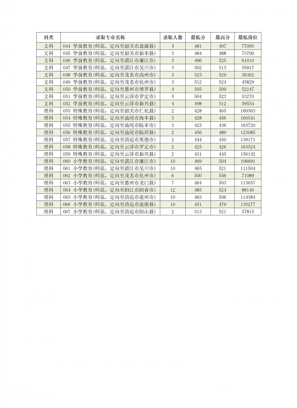 广东教师专项计划实行专业志愿优先投档,根据学校招生章程的录取原则,提前批教师专项计划文理类专业按“专业志愿优先”的原则录取,根据考生所填报专业志愿按考生投档总分排位情况从高分到低分录取。考生投档总分相同时,按照考生排位择优录取。最终文科类4人分数低录取额满退档,理科类3人分数低录取额满退档。各专业录取详情见下表。