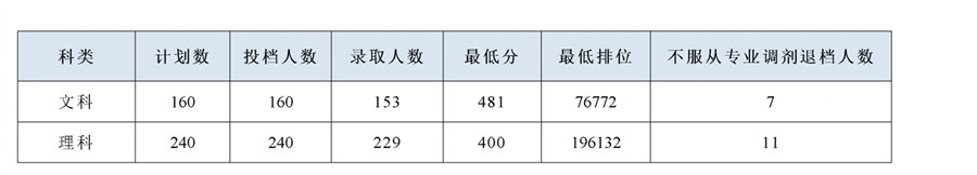 我校2019年广东省专科批文理科投档录取公告 录入: 负责编辑:招生办 浏览量: 发布时间:2019-08-02 广东省2019年专科批文理科于2019年8月1日投档,我校的文科投档分为481分(最低排位76772),原计划160人,投档160人;理科投档分为400分(最低排位196132),原计划240人,投档240人。文理科投档我校并服从专业调剂的考生全部录取,共有18人因所报专业无法录取并且不服从调剂的考生均退档。我校专科批文理科投档录取详情如下表: 岭南师范学院招生办公室 2019年8月2日 上一条:岭南师范学院2019年本科录取通知书第一批邮寄的公告(更新8-8) 下一条:我校2019年广东省专科批体育艺术统考类专业投档录取公告