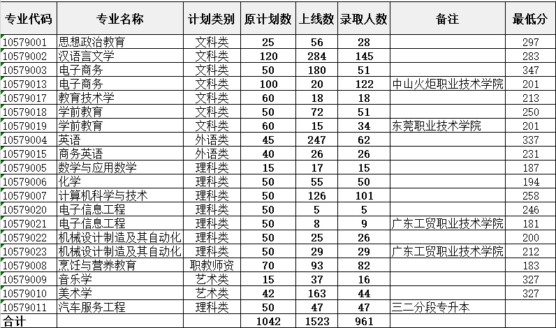 我校2020年本科插班生录取工作进展顺利,上线1523人。各专业上线人数与招生计划存在较大差异,为增加考生的就读机会,我校充分挖掘办学潜力,追加了部分招生计划,但受办学条件限制无法全部录取所有上线考生。7月27日,广东省招生委员会根据各科类划定的录取最低控制分数线,按学校各专业招生计划1:1投档,投档共有983人,22人因不服从教学点专业调剂而退档,录取考生共961人。现我校有学前教育(师范,东莞职业技术学院协同培养)专业缺档26人、电子信息工程(广东工贸职业技术学院协同培养)专业缺档42人、机械设计制造及其自动化(广东工贸职业技术学院协同培养)专业缺档29人,以上3个专业需要征集。最终录取以广东省招生办公室公布数据为准。现将我校各专业录取情况公布如下: