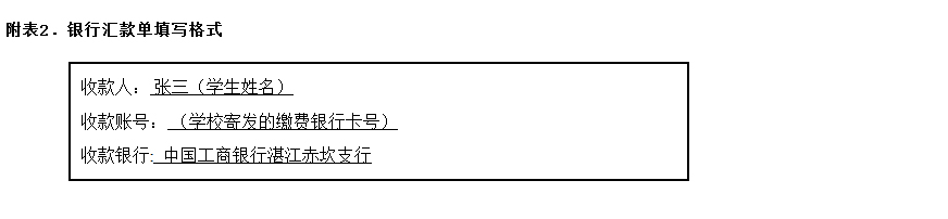 2.当地没有工商银行。可到当地其他任一家银行填写汇款单,也可通过手机银行或网上银行将学费和住宿费汇入学生本人缴费银行卡。学生到校后持本人身份证原件及缴费银行卡前往工行岭师分行或湛江市内任一所工商银行办理激活卡业务,否则该卡不能扣学费。
