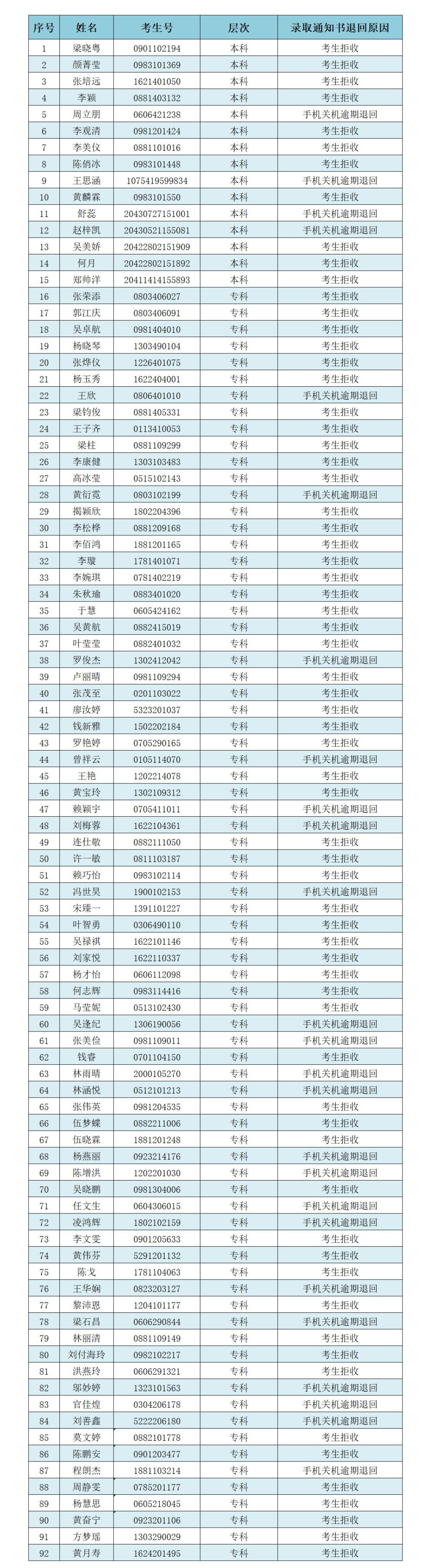 关于2020年新生录取通知书待领的公告 录入:招生办 负责编辑:招生办 浏览量: 发布时间:2020-10-28 我校2020年本科和专科录取通知书分别于9月份通过邮政EMS快件方式分批寄出,由于个别新生高考报名时填报的联系方式有误或停机,导致邮件无法投递被退回。我校对退回的邮件尝试各种方式联系考生,然后会再次邮寄,但仍有以下考生无法联系上。请下列考生看到公告后速与我校招生办公室联系,联系电话:0759-3183211。若10月31日前仍无法联系邮寄,我校将会对这些邮件当拒收件处理。 上一条:关于报送2021年招生计划需求的通知 下一条:关于做好2020年新生入学资格审查和不报到新生电子档案注销工作的通知