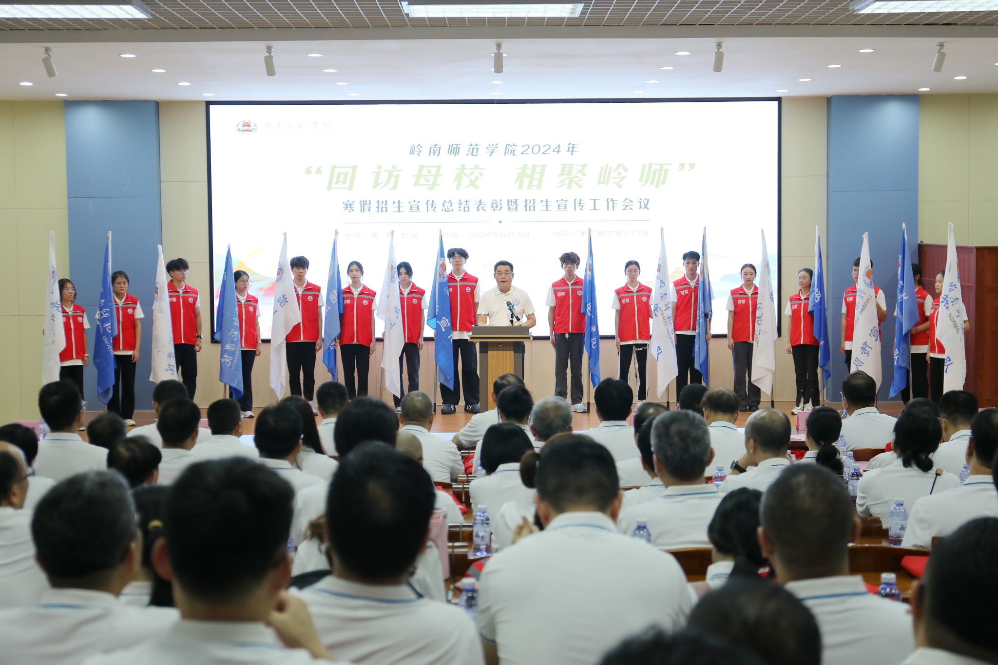 岭师新闻中心讯:6月3日晚上,学校2024年“回访母校 相聚岭师”寒假招生宣传总结表彰暨招生宣传工作会议在第三教学楼511室召开。校长阳爱民为二级学院招生宣传队授旗,副校长金义富为寒假招生宣传获奖队伍颁奖,党委常委、宣传部部长刘坤章为招生宣传大使颁发聘书。会议由招生与就业处处长李粤主持。