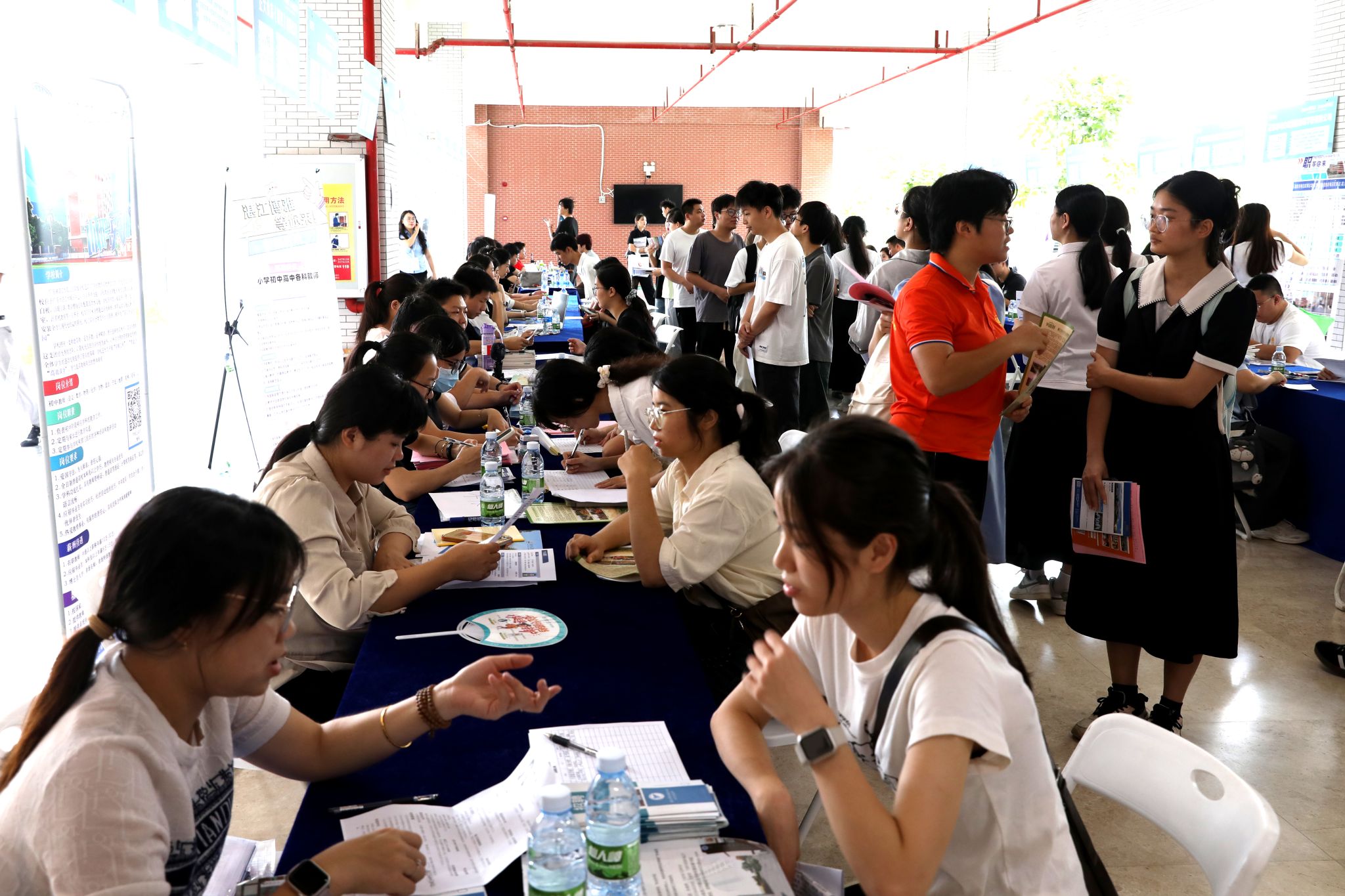 在学校第五教学楼招聘会现场,旌旗飘动,人头攒动。东莞市东方明珠学校、广东恒兴集团有限公司等招聘单位档口,一位位手拿简历应聘的毕业生洋溢着青春的笑脸有序地排起了长龙。数字广东网络建设有限公司、广东绿百多生物开发有限公司等单位的人事招聘负责人正在和应聘学生微笑着交谈。