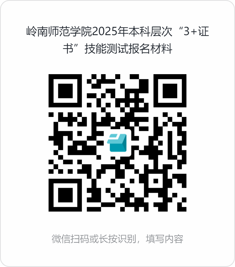 已填报我校志愿的考生,请于2025年3月16日至17日17:00报名参加我校2025年“3+证书”职业技能测试。点击链接(https://f.wps.cn/g/5TSKEpud/)或扫描下方二维码填写个人信息并按要求上传相关材料进行报名。