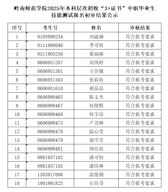 关于公布我校2025年本科层次招收“3+证书”中职毕业生报名初审结果的通知 录入: 负责编辑:招生办 浏览量: 发布时间:2025-03-18 根据《岭南师范学院2025年招收中职毕业生“3+证书”考试招生录取工作方案》、《岭南师范学院2025年本科层次招收“3+证书”中职毕业生招生简章》相关要求,在规定的时间内共收到18份考生报名材料。经我办审核,共有刘淑涵等18名考生(名单见附件)符合报名条件。请合格的考生及时留意招生办网站相关通知,并按照《岭南师范学院2025年本科层次招收“3+证书”中职毕业生招生简章》做好相关工作。 上一条:我校2025年本科层次招收中职毕业生职业技能测试准考证打印公告 下一条:岭南师范学院2025年本科层次招收“3+证书”中职毕业生招生简章