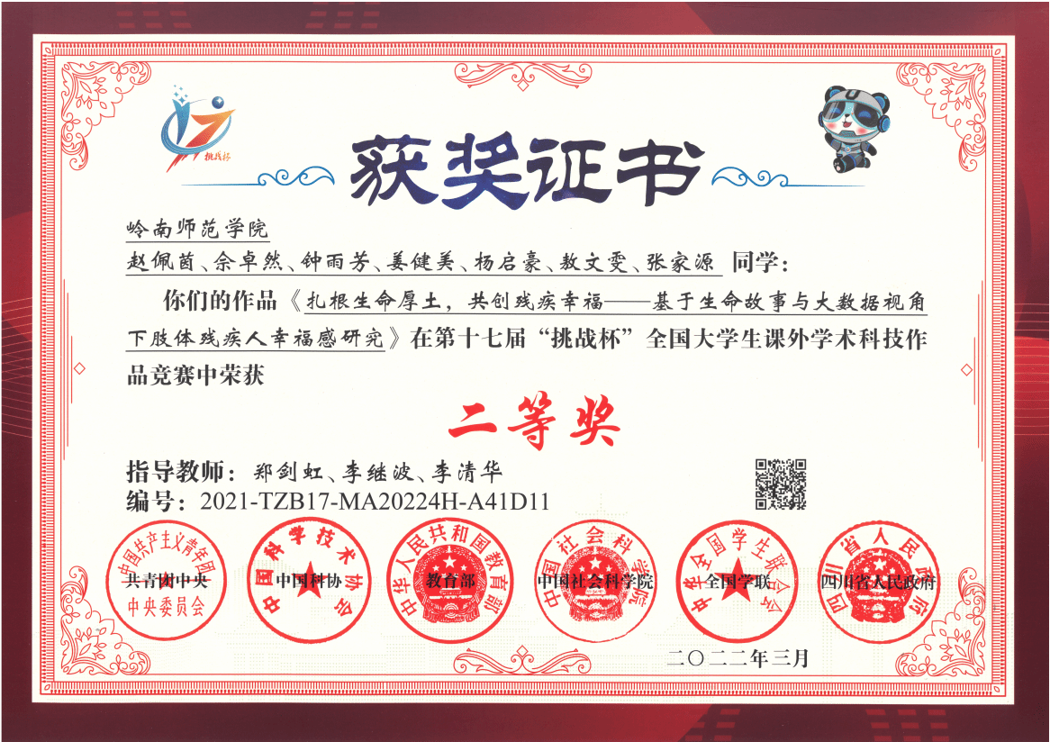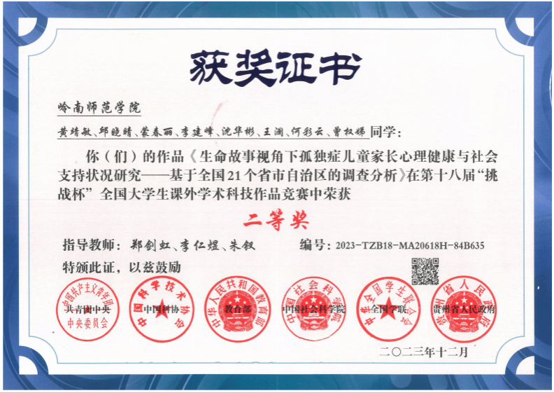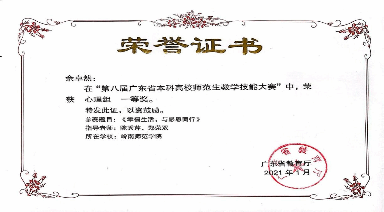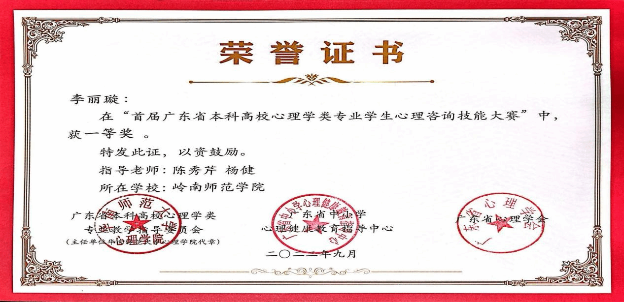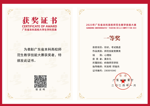 10年来,心理学专业本科生参加“挑战杯”全国和全省大学生课外学术科技作品竞赛,共获得国赛奖和省赛奖20多项,其中全国二等奖2项,三等奖1项,省赛特等奖6项,一等奖4项。参加广东省师范生技能大赛和广东省本科高校心理学专业学生心理咨询技能大赛共获奖项39项,其中一等奖4项,二等奖6项。