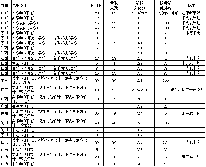 2015年艺术类专业招生录取分数线统计 录入:zsbxs01 负责编辑:zsbxs01 浏览量: 发布时间:2016-01-09 注:以下统计数据除注明“统考”外都是采用校考成绩录取。 117 更多 上一条:2015年各省普通本科录取分数统计(艺术类、体育类) 下一条:2015年普高本科各专业录取分数统计表(广东•文理)
