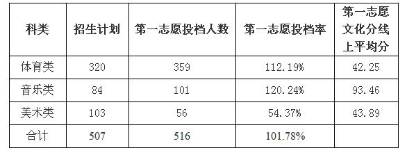2010年湛江师范学院广东省体育、音乐、美术类招生录取情况公布 录入:zsbxs02 负责编辑:zsbxs02 浏览量: 发布时间:2010-07-20 7月17日,我校广东省体育、音乐、美术类第一志愿投档及录取综合情况如下表。我校体育类、音乐类生源很好,体育录取文化分线上平均分42.25分,音乐类文化分线上平均分为93.46分。美术类第一志愿缺47个,将在第二志愿录满。 招生与就业处 二0一0年七月十九日 4 更多 上一条:2010年湛江师范学院部分省外艺术类招生录取情况公布 下一条:关于我校2010年普通高考体育、音乐、美术类招生录取结果网上查询的公告