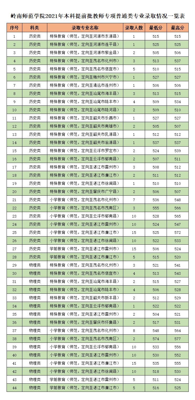 广东教师专项计划实行“分数优先”原则投档,根据学校招生章程的录取原则,提前批教师专项计划普通类专业按考生投档总分排位情况从高到低录取。各专业投档录取详情见下表。