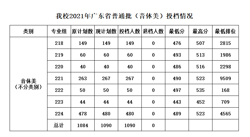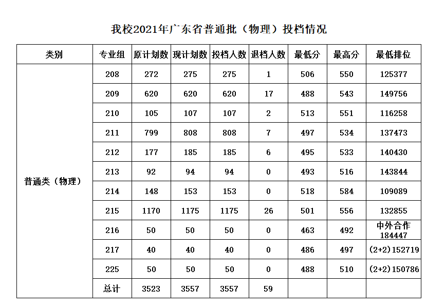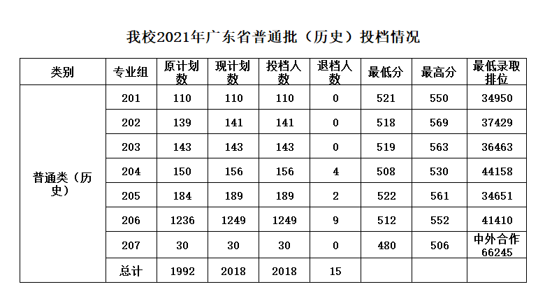 我校2021年广东省的本科批普通类于2021年7月21日开始投档。我校生源充足,高分生源人数增幅明显,成绩喜人。具体投档情况如下: