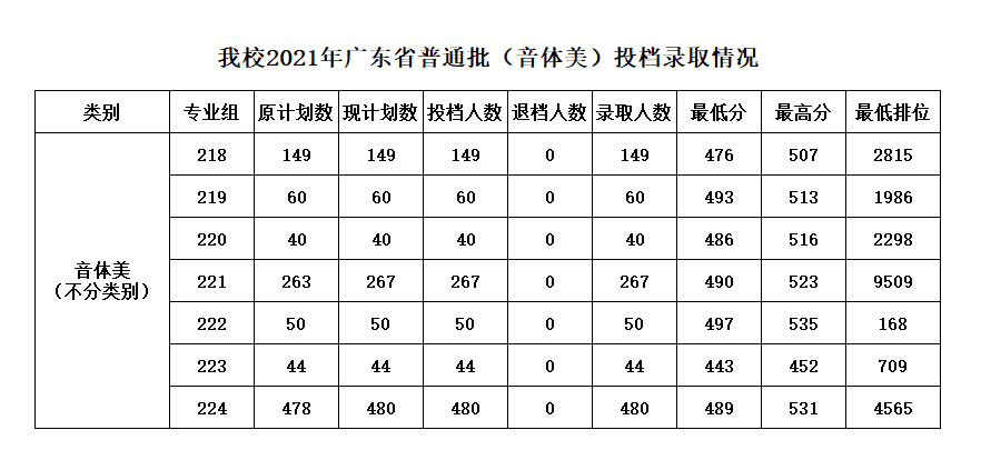 我校2021年广东省本科批体育艺术类统考专业于2021年7月21日投档,所有专业均第一志愿满档。各类投档最低分分别为:体育489分、美术490分、音乐476分、舞蹈443分和书法497分。无考生因不服从专业调剂无法录取所报专业而退档。现将我校体育艺术类统考投档录取情况公布如下: