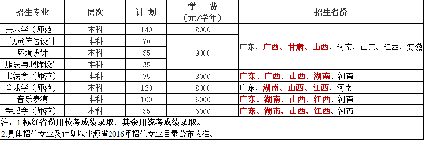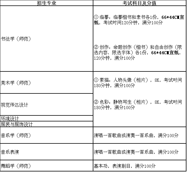2.广东省(美术类、音乐学)使用省联考成绩录取,不需参加校考;但是广东考生报考音乐表演、舞蹈学、书法学专业须参加校考。