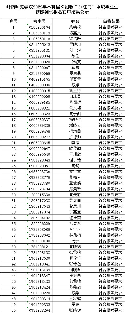 关于公布我校2022年本科层次招收“3+证书”中职毕业生报名初审结果的通知 录入: 负责编辑:招生办 浏览量: 发布时间:2022-03-16 根据《岭南师范学院2022年招收中职毕业生“3+证书”考试招生录取工作方案》、《岭南师范学院2022年本科层次招收“3+证书”中职毕业生招生简章》相关要求,在规定的时间内总共收到50份考生报名材料。经我办审核,共有梁锦权等50名考生(名单见附件)符合报名条件。请合格的考生及时留意招生办网站相关通知,并按照《岭南师范学院2022年本科层次招收“3+证书”中职毕业生招生简章》做好相关工作。 岭南师范学院招生办公室 2022年3月16日 上一条:关于岭南师范学院2022年本科层次招收中职毕业生职业技能测试采用线上方式开展的通知 下一条:岭南师范学院2022年“3+证书”烹饪与营养教育专业职业技能测试大纲