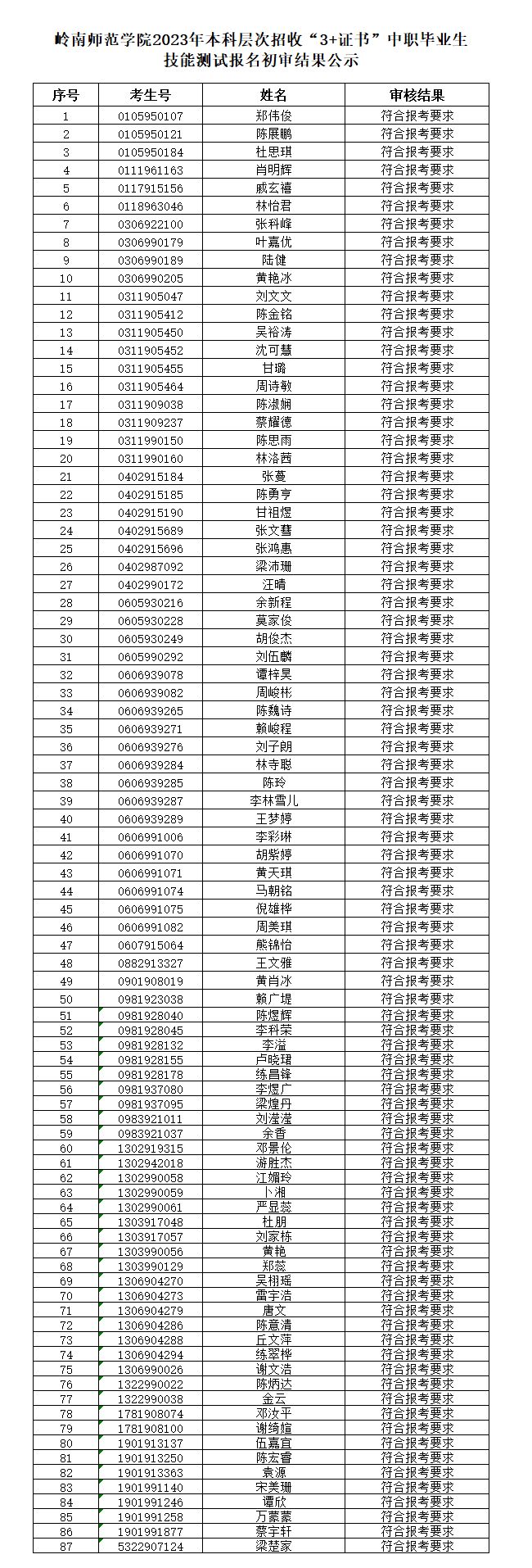 关于公布我校2023年本科层次招收“3+证书”中职毕业生报名初审结果的通知 录入: 负责编辑:招生办 浏览量: 发布时间:2023-03-22 根据《岭南师范学院2023年招收中职毕业生“3+证书”考试招生录取工作方案》、《岭南师范学院2023年本科层次招收“3+证书”中职毕业生招生简章》相关要求,在规定的时间内总共收到87份考生报名材料。经我办审核,共有郑伟俊等87名考生(名单见附件)符合报名条件。请合格的考生及时留意招生办网站相关通知,并按照《岭南师范学院2023年本科层次招收“3+证书”中职毕业生招生简章》做好相关工作。 岭南师范学院招生办公室 2023年3月22日 上一条:我校2023年本科层次招收中职毕业生职业技能测试准考证打印公告 下一条:岭南师范学院2023年“3+证书” 烹饪与营养教育专业职业技能测试大纲